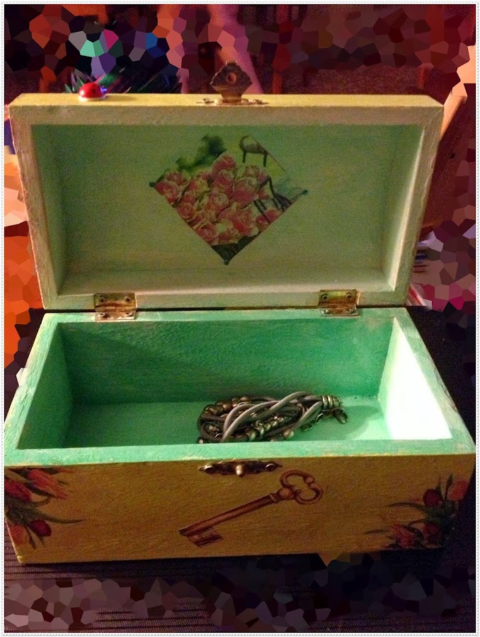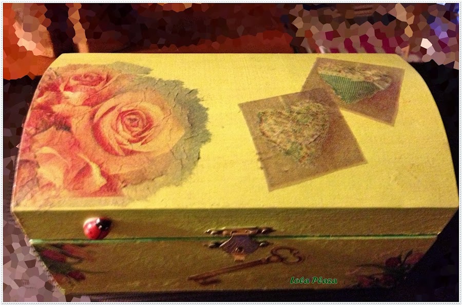 Joyero vintage, realizado con la técnica decoupage, craquelado y envejecido con betún. Como adorno blondas realizadas con arilla polimérica y lacito.