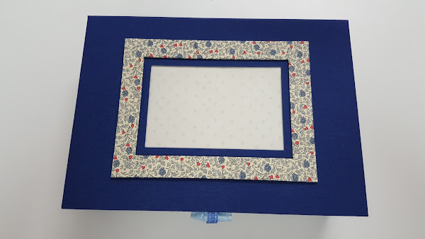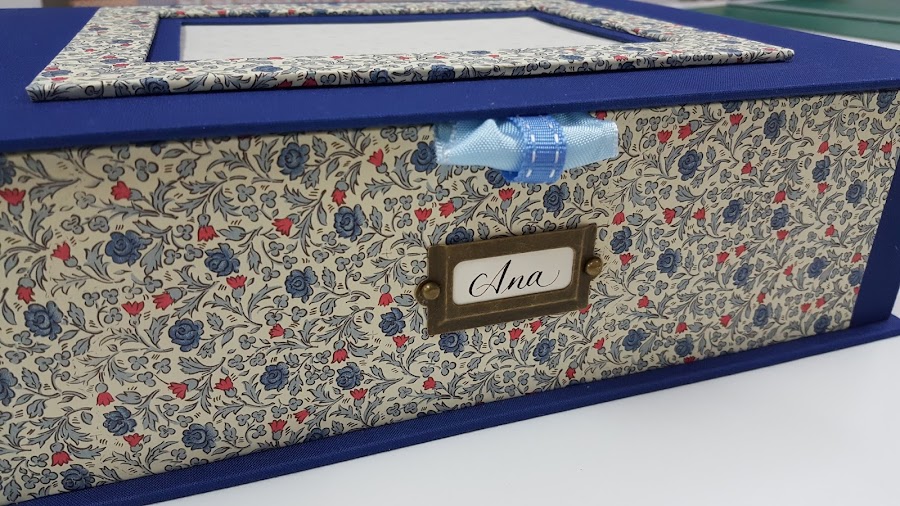 Caja de 25*8*20 con dos alturas, bandeja superior con seis divisiones e inferior con la misma cantidad. Porta fotos con paspartú en la tapa superior y personalizada con su nombre en caligrafía.