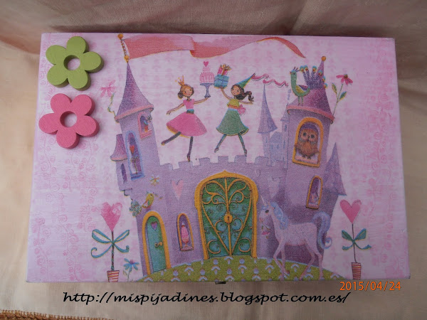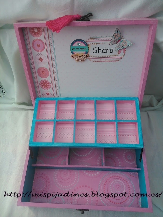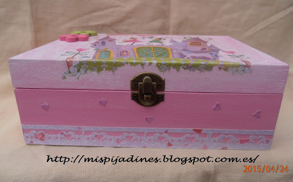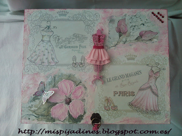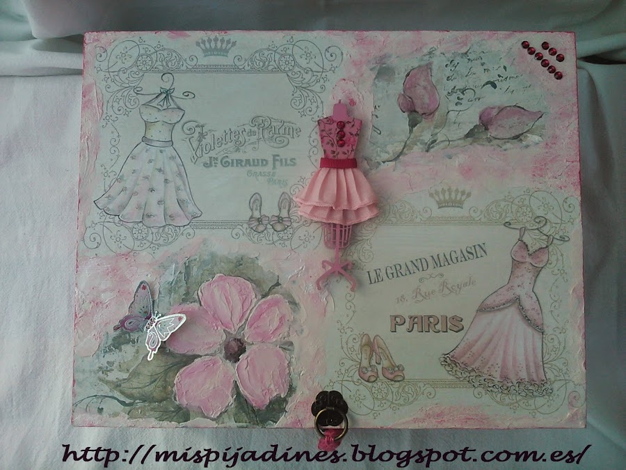 En la tapa lleva varias técnicas, sobre fondo blanco, decoupage con laminas de Dayka (me encantan), estuco con aguadas en rosa y para adorno un vestido sobre maniqui en DM.