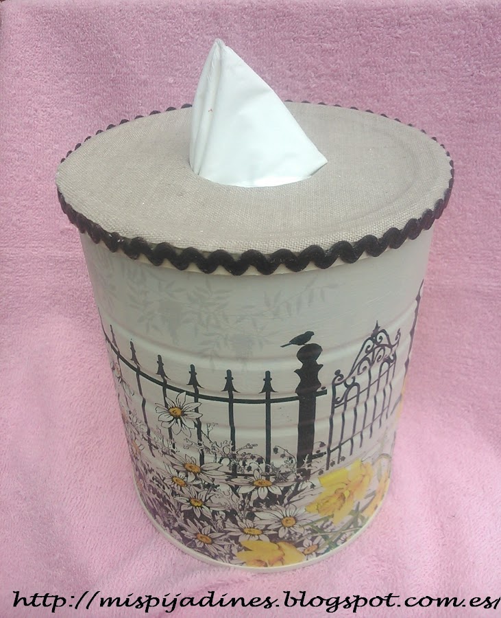 Bote de leche infantil con decoupage y tela convertido en un bonito estuche de pañuelos