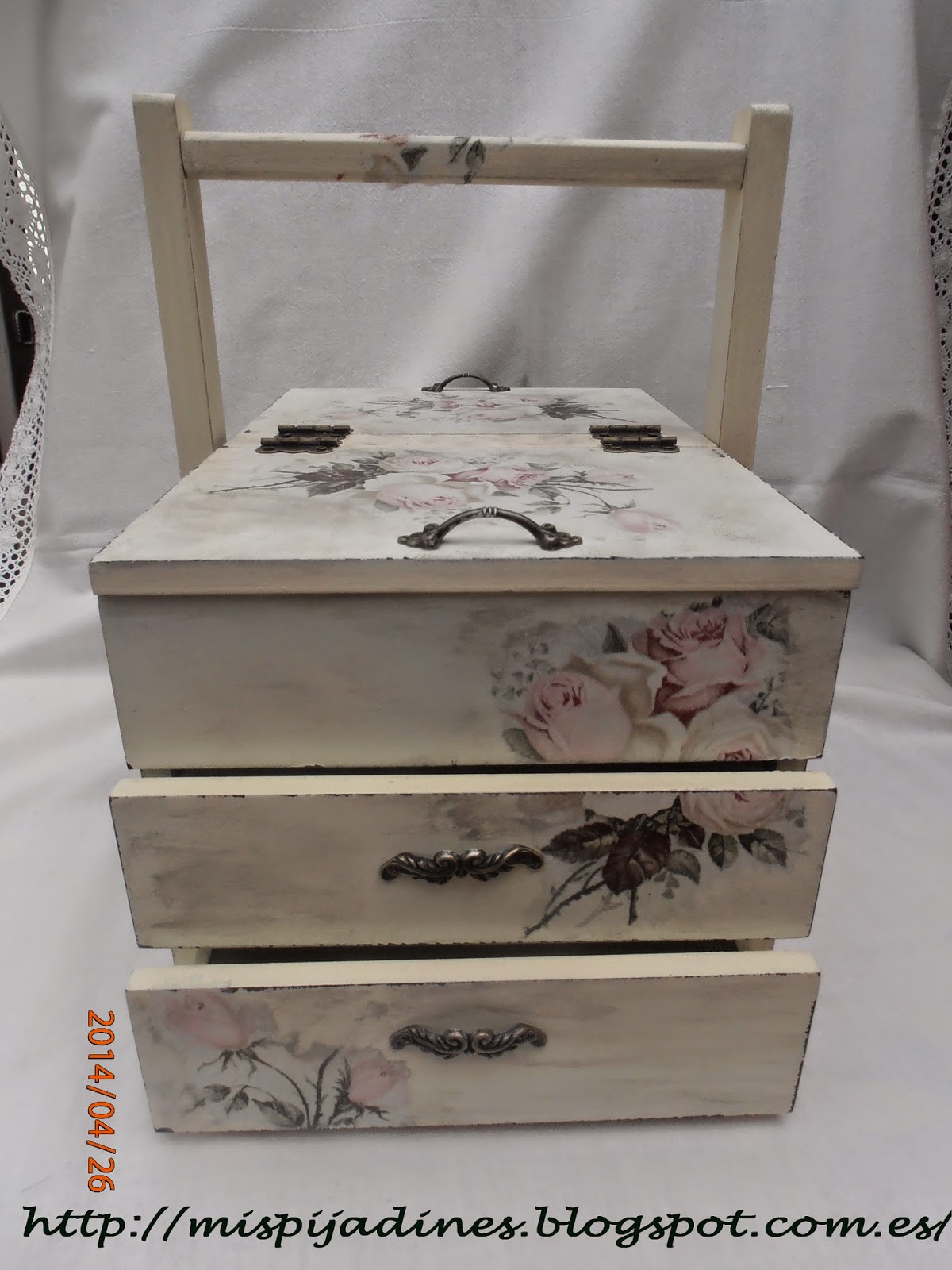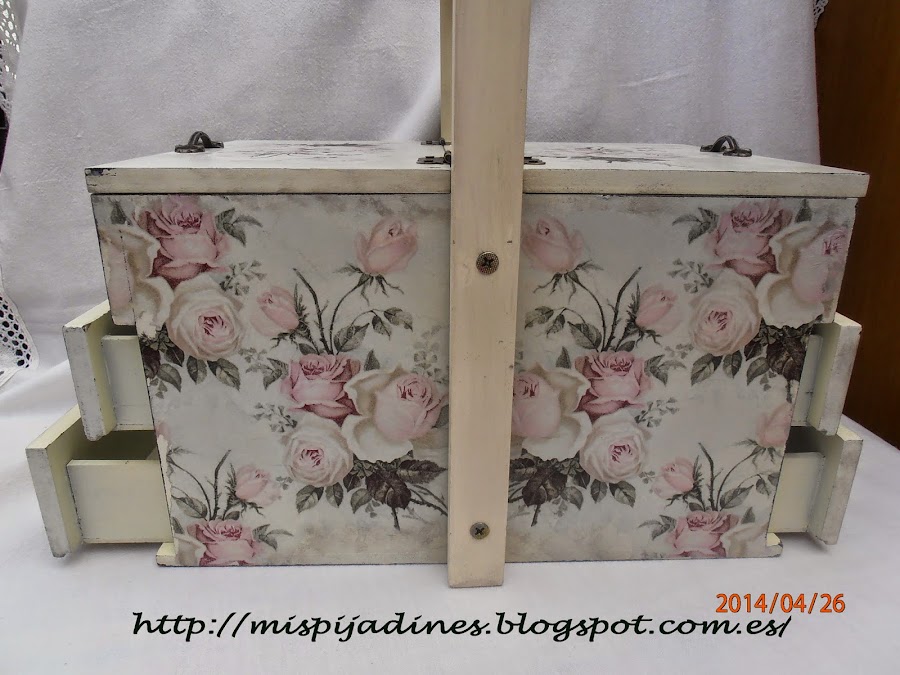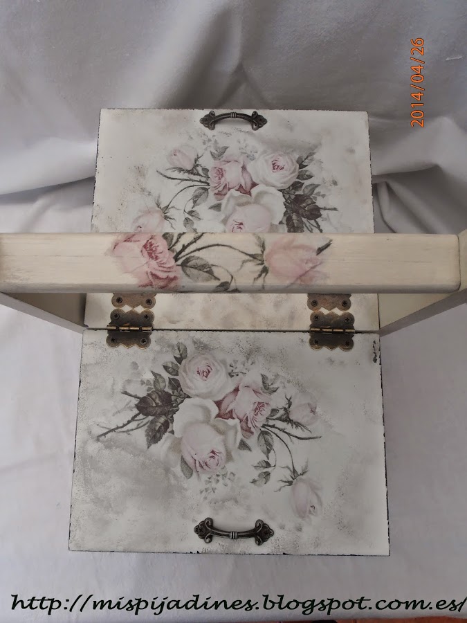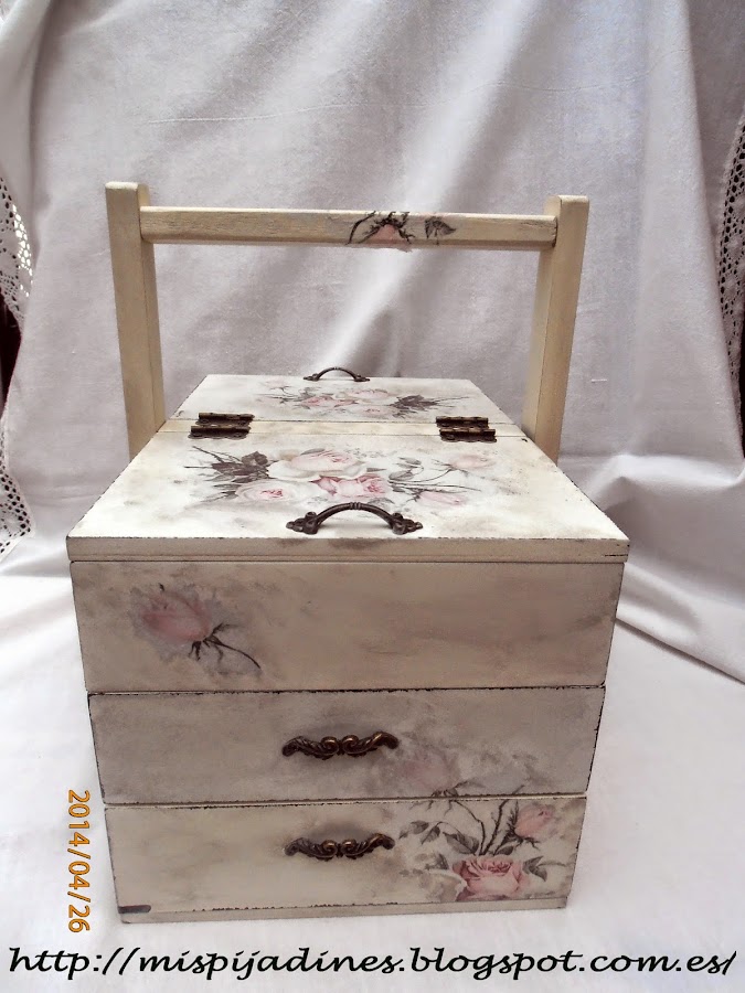 Esta pintada en color blanco roto, y lijada para sacar el color de abajo y darle ese toque envejecido que le da un aire muy vintage... la servilleta que he utilizado para el decoupage es muy bonita y seguro que la habéis visto en mas trabajos de compañeras