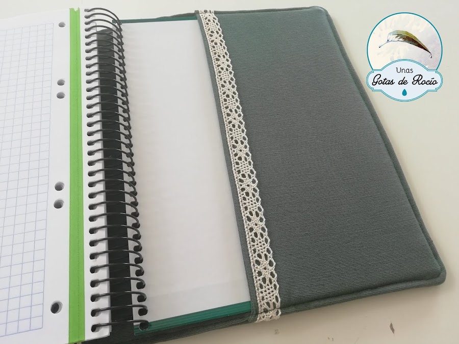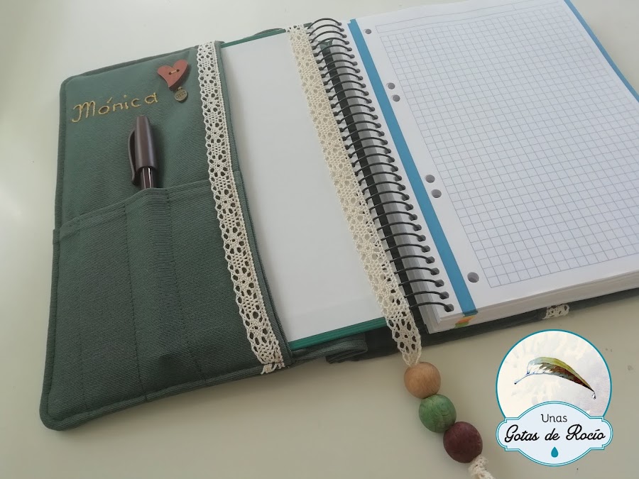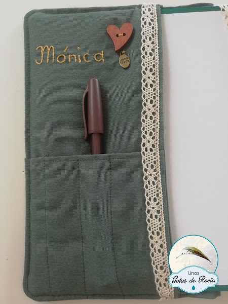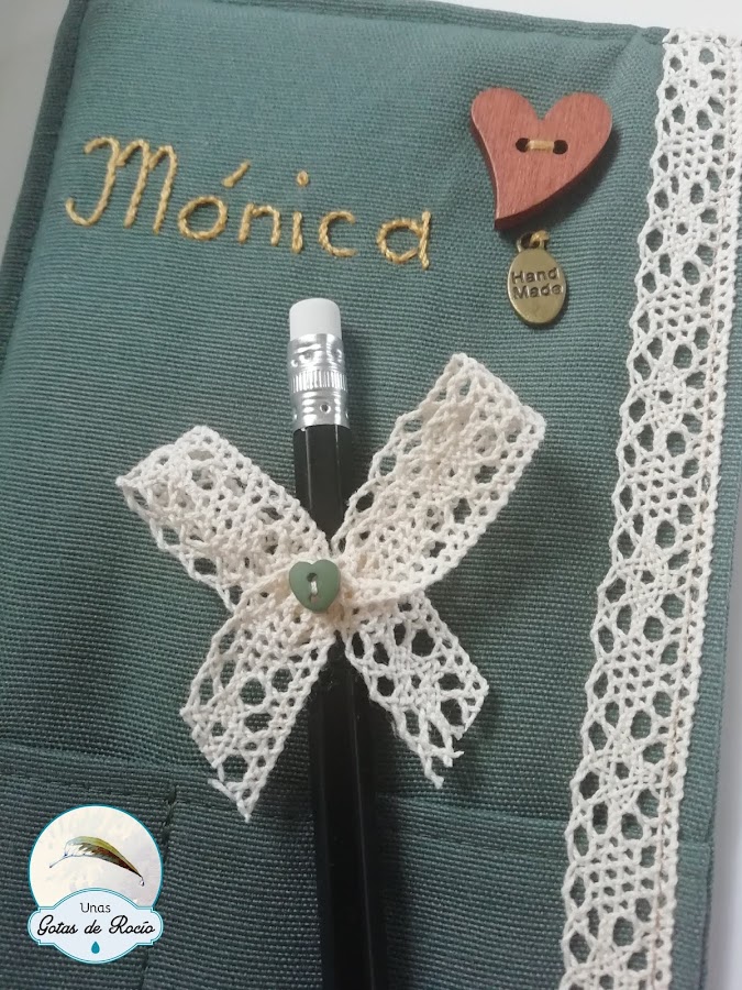 Bolsillos para guardar bolígrafos, un corazón de madera, un charm de handmade y encaje de bolillo que tanto le gustan.