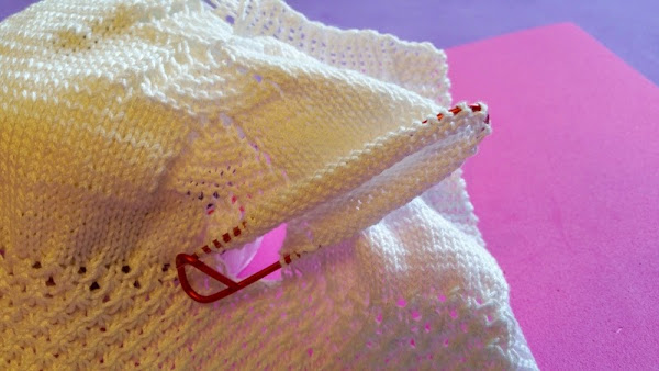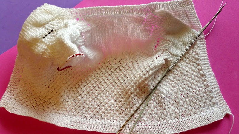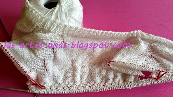 UNA VEZ , TEJIDO EL CANESÚ, he separado las mangas , y para una mayor holgura y comodidad, he AUMENTADO 8 PUNTOS debajo de cada bocamanga