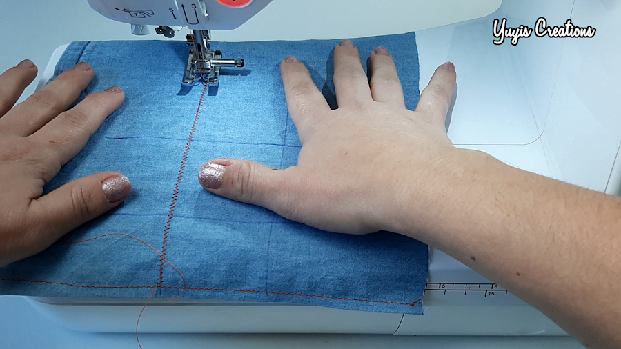 Ahora vamos a la máquina y cosemos con puntada en zigzag por donde hemos marcado. Una vez hagamos la primera costura, giramos la tela y volvemos a coser encima, de ésta manera quedará más tupido y el color del hilo resaltará más. Esto lo hacemos con cada una de las marcas.