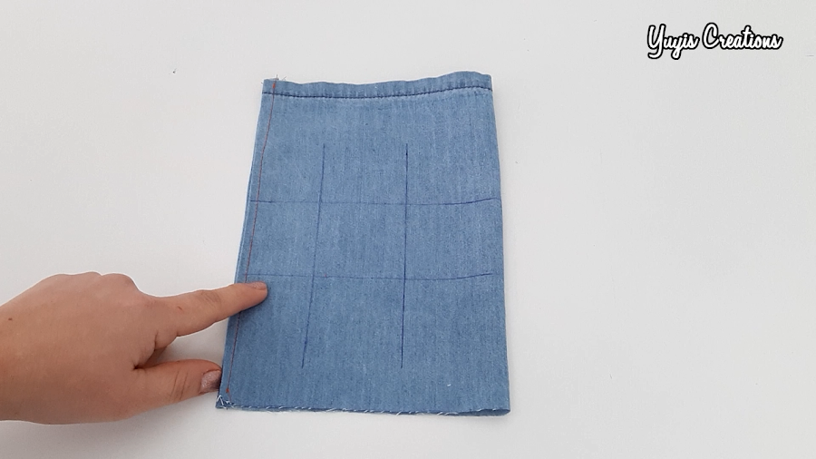 Luego, doblamos la pieza de forma que el derecho quede a la vista, y hacemos las marcas del juego: dos en horizontal y dos en vertical, así como vez en la imagen de abajo.