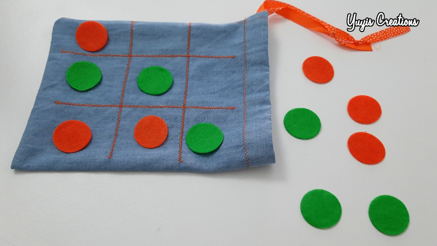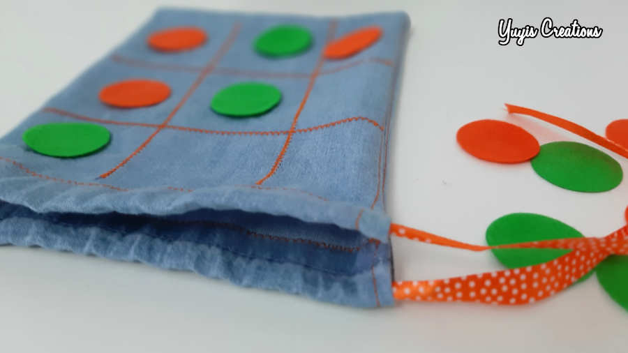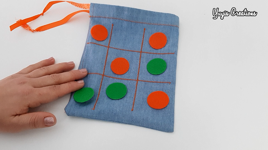 Sólo nos queda darle la vuelta a la bolsita y pasar la cinta o cordón, y listo! Ya tenemos nuestro juego de mesa, sin necesidad de gastar papel y además lo podemos llevar con nosotros a donde quiera que vayamos (pero no ahora, mejor quédate en casa!)