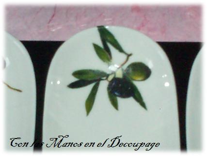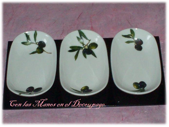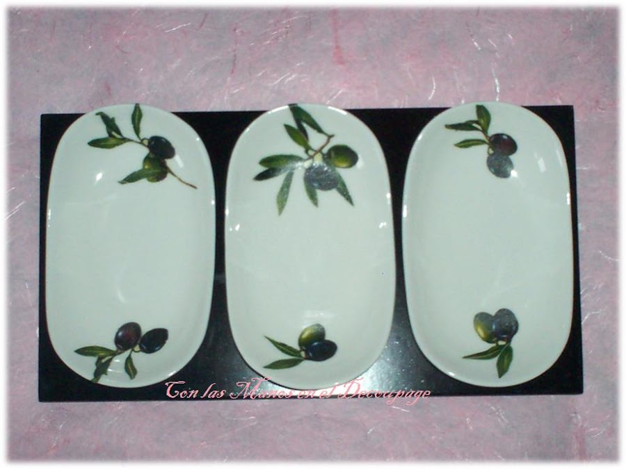 Y ahora os presento un juego de bandejas para aperitivo en porcelana con su bandeja en madera, lo adorne con servilletas, elegí el motivo de olivas, porque son ideales para sacar las aceitunas, pepinillos y esas cositas que están tan ricas.