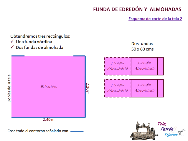 Siguiendo la línea azul del esquema, cosemos y sobrehilamos todo alrededor de la funda del edredón, dejando una apertura de 1,50 metros, donde luego colocaremos los automáticos.