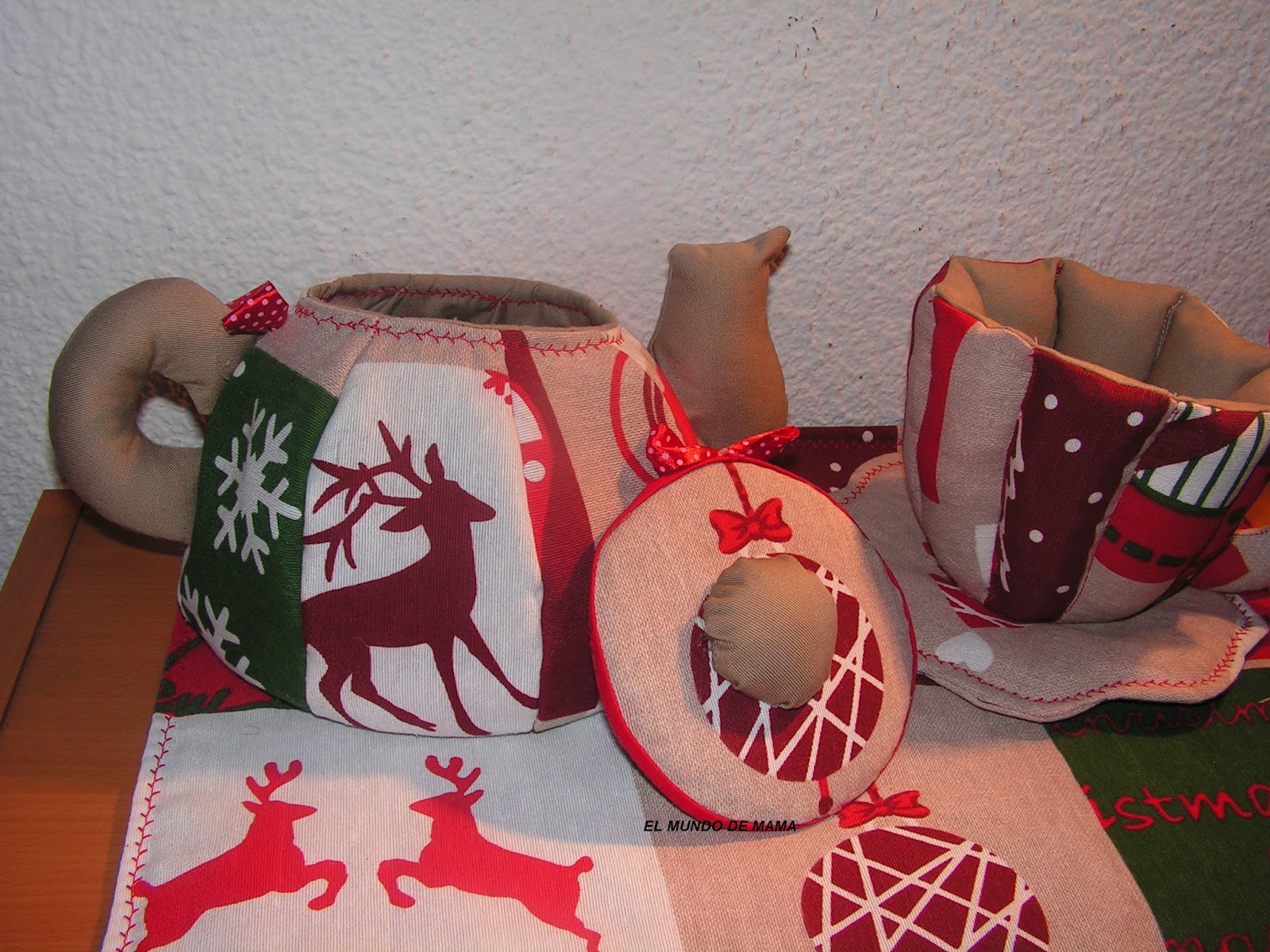 Espero que te guste este juego de te navideño hecho con tela, es una forma diferente de decorar para navidad, este juego de te navideño lo puedes personalizar a tu gusto. Servirá para adornar tu casa.