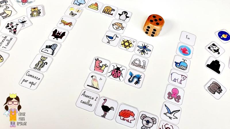 Con los pines de los animales, el objetivo es hacer un tablero a gusto del niño o la niña. Incluyo unos pines Comienza aquí Avanza 2 casillas Retrocede 3 casillas Fin para darle más dinámica al juego.