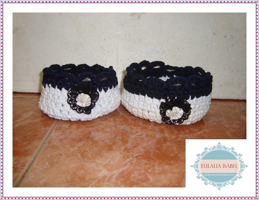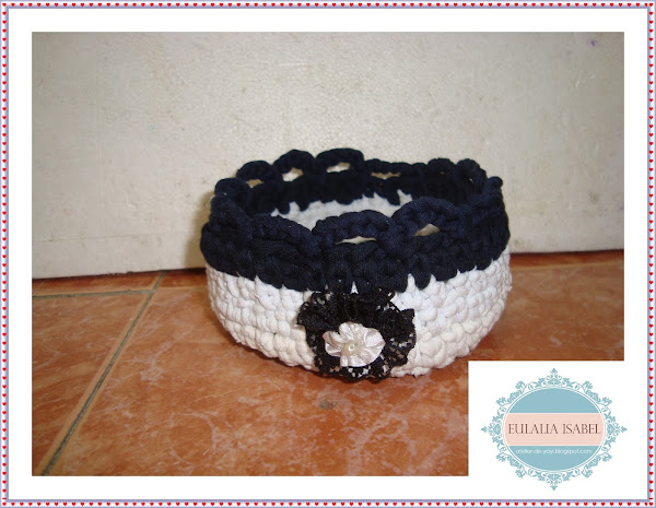 PORTA SERVILLETAS TEJIDO EN HILO BLANCO Y NEGRO, LAZO DE ENCAJE NEGROY FLORCITA DE CINTA BLANCA.