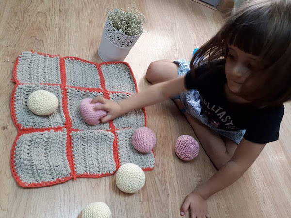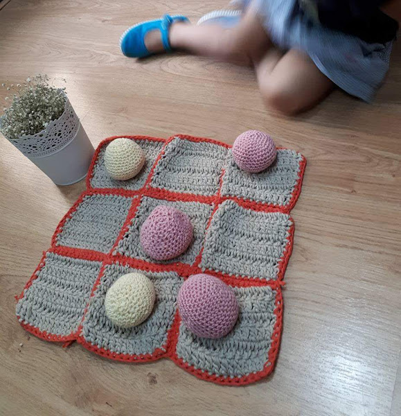 Son 9 cuadros tejidos a punto medio alto y con un borde cada uno en punto bajo . Luego se cosen todos los cuadrados entre ellos y ya tendriamos el tablero.