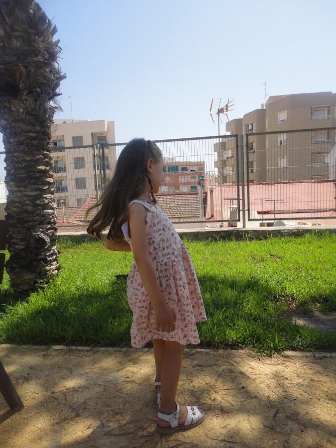 Es un vestido de dos piezas, la parte superior es cuadrada con la forma de la axila, en la parte de delante lleva dos botones para sujetar los tirantes y adornar el escote.