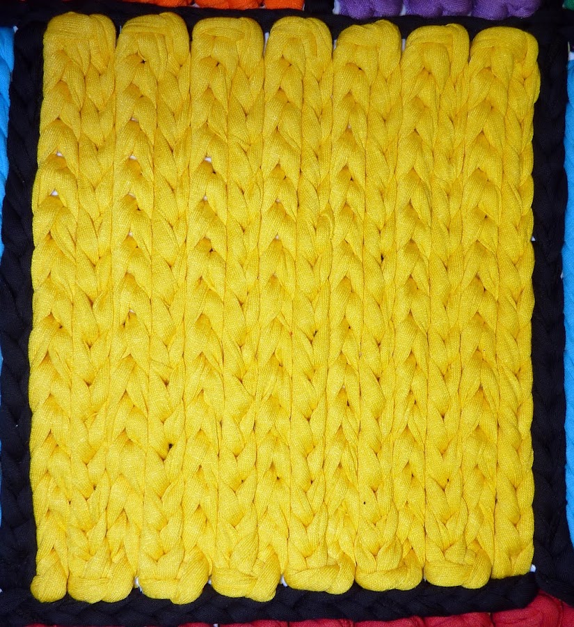Aquí os muestro en detalle un par de piezas de la alfombra, cada una la he enmarcado con trapillo de color negro para que quedasen perfectamente definidas.