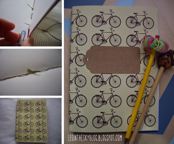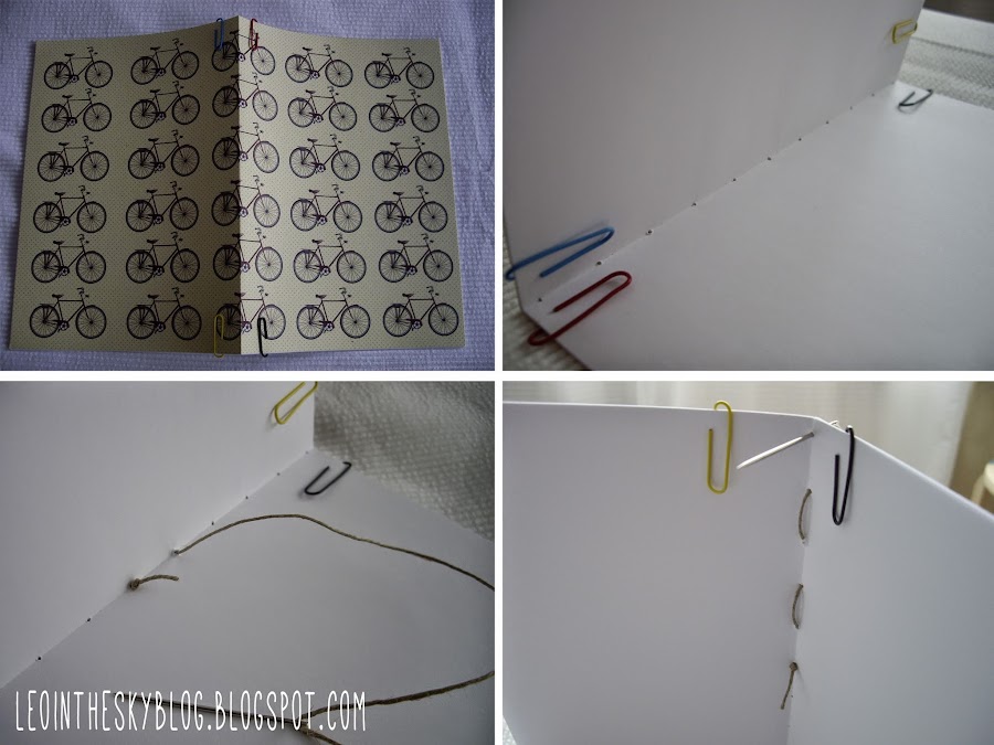Doblé las hojas blancas y la hoja de las bicis por la mitad,hice unos agujeros con una aguja gruesa y cosí todo con cuerda. Y para decorar la portada le pegué la etiqueta que venía en el kit.
