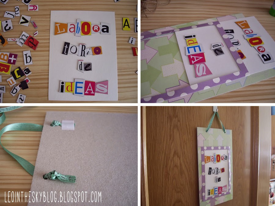 Tiene una ventanita o marco en el que se puede meter y sacar una postal, una foto o un cartel como el que yo hice, pegando letras de revistas (en este caso son imanes de Tiger) y para colgarlo una cinta de raso que también venía en el kit.