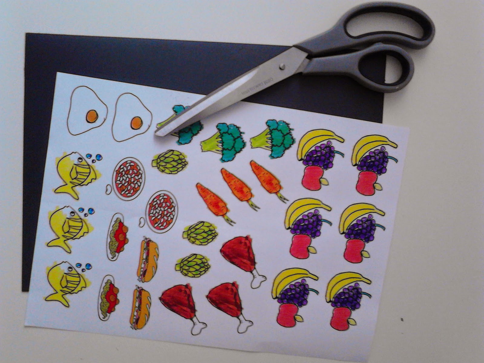 Principalmente dibujé fruta, verdura, carne, pescado y huevos ya que es lo que considero que tendría que controlar. Lácteos, pan y arroz (o cereales) come muchos, por tanto no me preocupan.