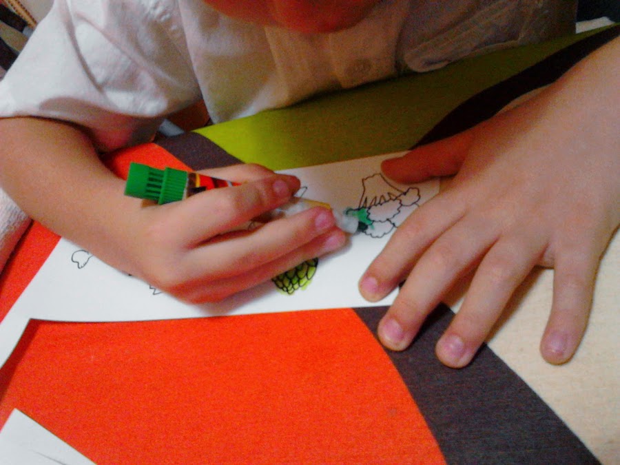Pues el mío, como tiene un poco de lío y aprovechando que hemos tenido unas tardes de mal tiempo y lluvia, se me ocurrió dibujar unos cuantos alimentos, él se encargó de pintarlos y luego el scaner y el photoshop hicieron el resto.