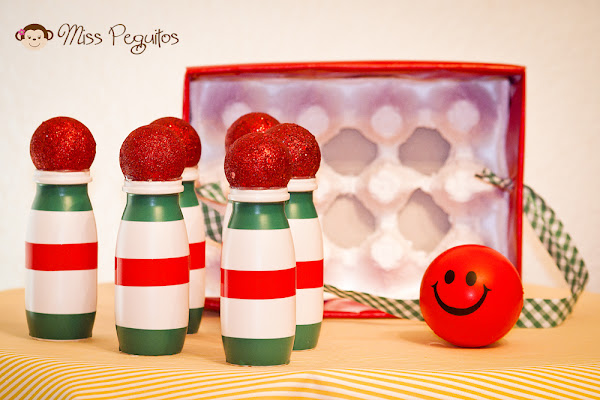 Fácil, rápido y baratísimo. El cuerpo de los bolos son botecitos de Actimel, la cabeza una pelota de pin pon y para decorarlos cinta aislante de colores. Para guardarlos, una caja de zapatos forrada con papel de regalo y un cartón de huevos dentro para colocar los bolos, cinta de bies como asa y listo.