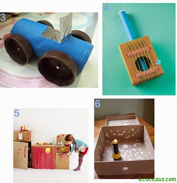 Con materiales que solemos tener en casa podemos tener en un instante un coche con un rollo de papel y unos tapones! Una guitarra, o ukelele más bien, para los músicos de la casa. Una completisima cocinita con todos sus electrodomésticos consiguiendo cajas de varias alturas. Y con una caja de zapatos podemos tener el cielo a nuestros pies.