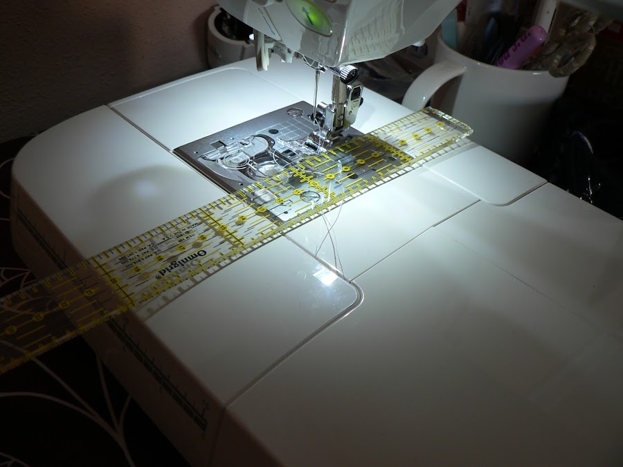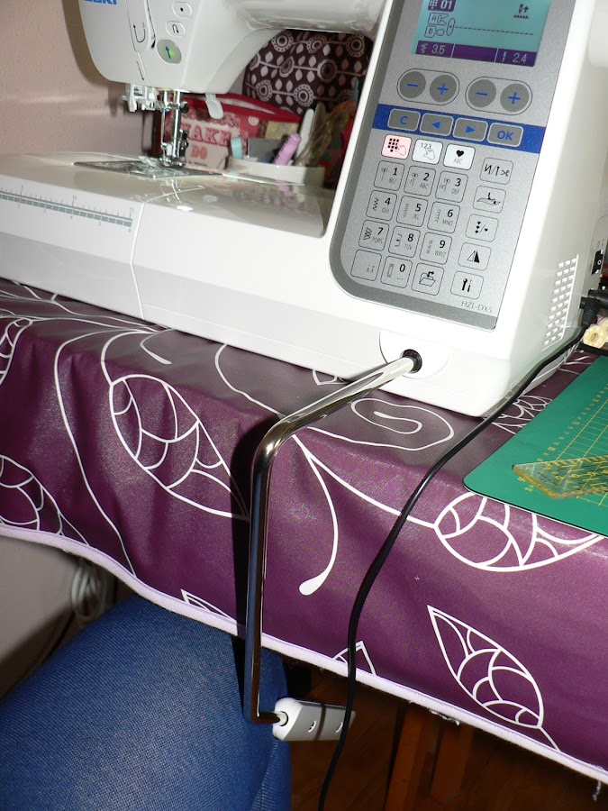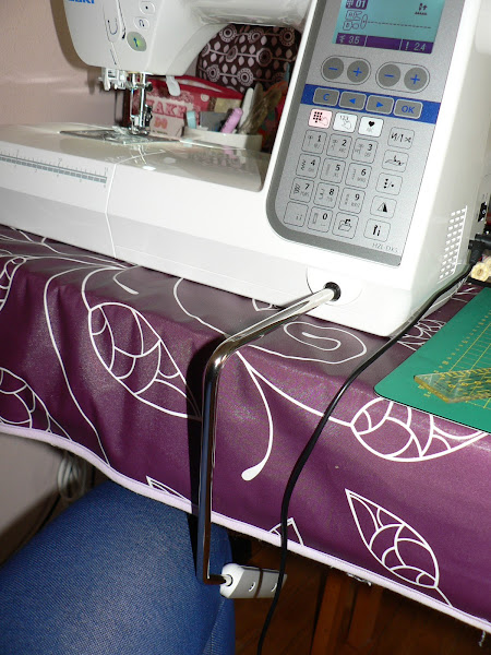 La palanca rodillera..... Qué voy a decir de la palanca rodillera..... Yo soñaba con algo así antes de saber que existía. Sabía que la iba a usar y es que ya no sé coser sin ella. La palanca funciona moviendo la pierna hacia fuera. Empujas con la rodilla y levantas el prensatelas. Es genial para coser esquinas, acolchar, hacer patchwork..... Simplemente la amo, cuando no me golpeo con ella al intentar levantarme de la silla, eso sí.
