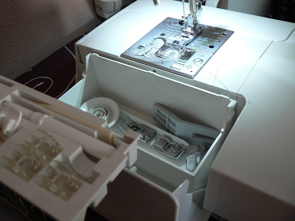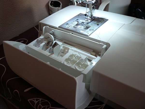 La funda dura es un pro y una contra a la vez. Definitivamente es más segura que una de tela, pero en mis anteriores máquinas usaba fundas de tela y cuando la quitaba para coser, directamente la colgaba en el respaldo de la silla y era muy cómodo. Este mamotreto anda siempre por medio y ocupa un mundo, porque la máquina es enorme. Sé que en algún momento me cansaré de pasearla por casa cada vez que quiero coser pensando a ver dónde no molesta y que acabará en un armario.