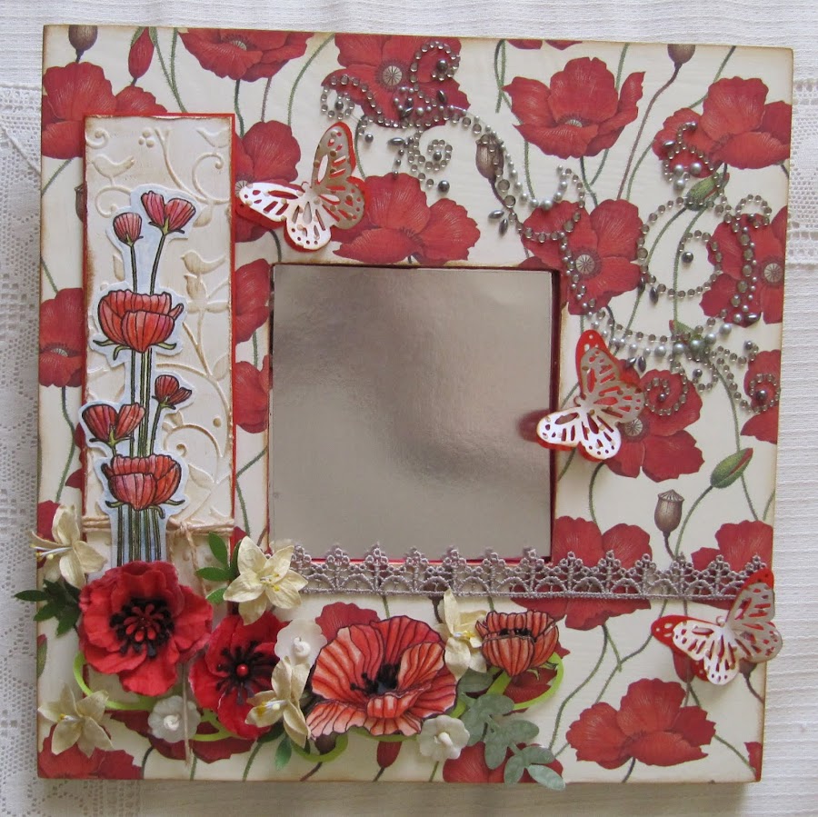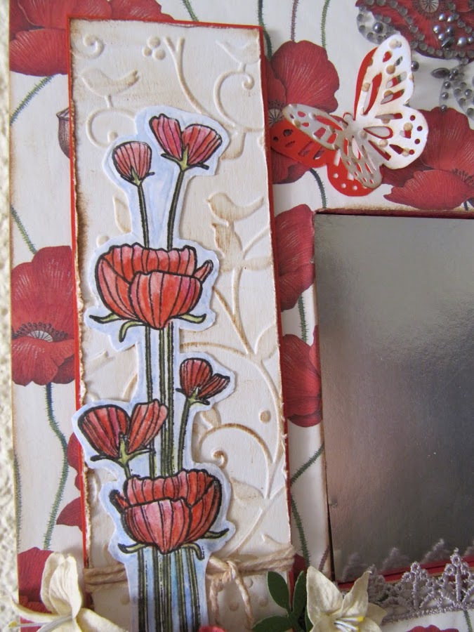 Espejo malma de IKea --- acrílico blanco y rojo --- papel para manualidades --- embellecedor arabesco de Prima --- puntilla --- placas de embosar de Cuttlebug ( la de los pajaritos) y Sizzix (la de los puntitos), sobre cartulina blanca, rasgada por los bordes y entintada con Distress- Vintage photo --- cordón blanco envejecido con Distress --- sello de amapola de Hero Arts, coloreado con colores acuareábles , el relieve lo he hecho utilizando la técnica de paperpiecing, dando volumen con cinta de 3d --- FLORES: las amapolas rojas fuertes son hechas a mano con ayuda de un tutorial What a Beautiful Mess, tinta Distress – Barn door , troquel de Artemio y perlitas -- botones -- las florecitas blancas son de Magnolia --- HOJAS : unas con troquel arabesco de Sizzix y otras son regalo de Lourdes --- MARIPOSAS: Distress – Vintage photo, sobre cartulina blanca y enmarcadas con otra mariposa de cartulina roja son hechas con un troquel Martha Stewart, embosadas con la placa de Sizzix y entintadas con Distress