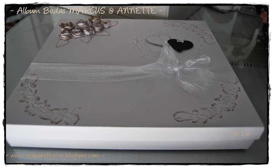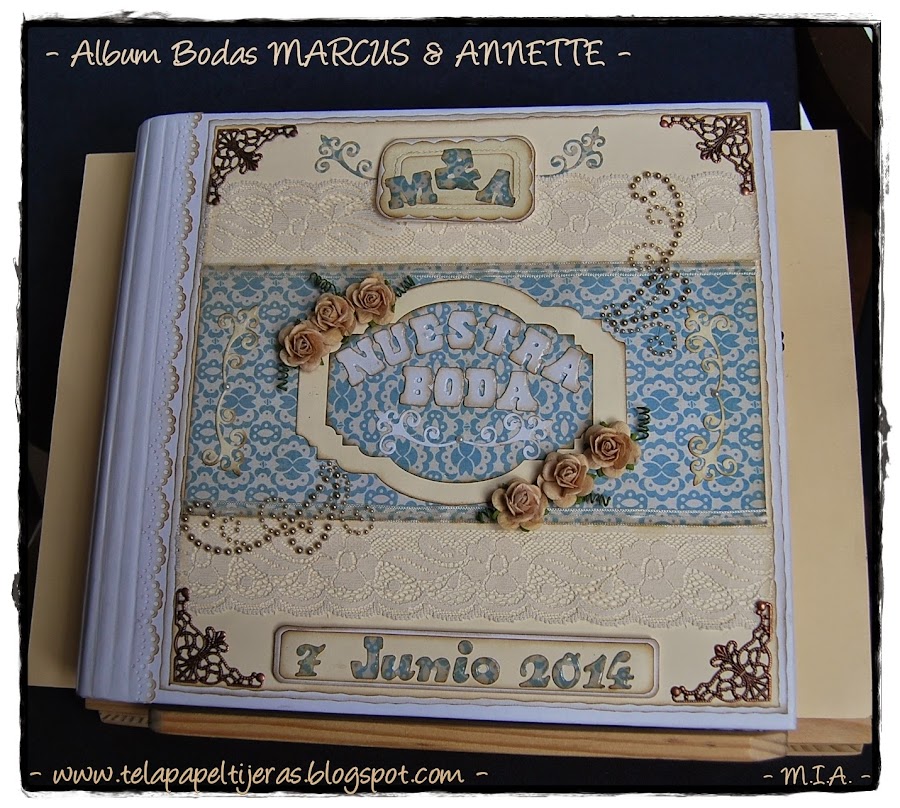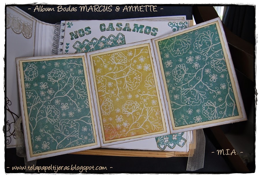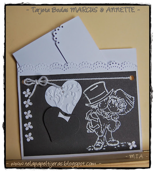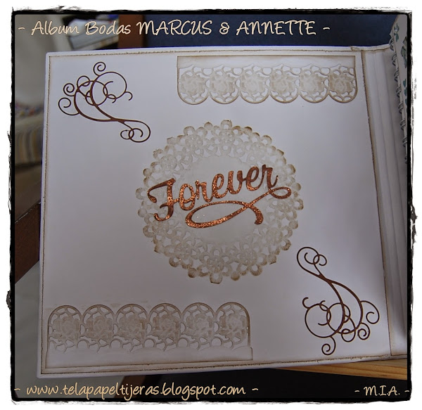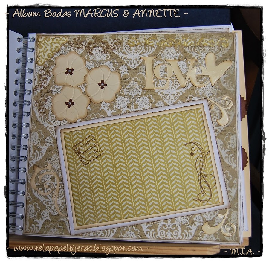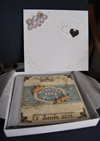 Los papeles de la Colección de "My Mind´s Eye" ... Y como adornos troquelados, perlitas, encajes, sellos y mucho, mucho cariño esperando que sea un bonito recuerdo para los novios de ese día tan importante...