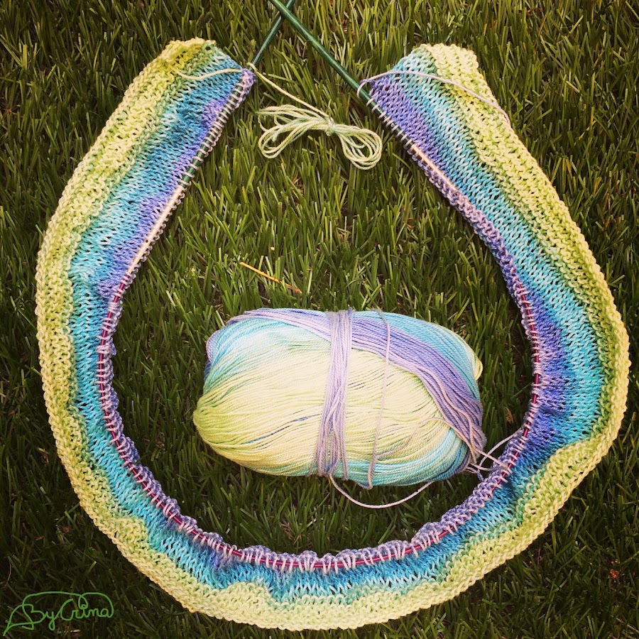 Tenía unos ovillo de Katia que compré a principios de verano y no sabia qué hacer con ellos, así que decidí emplearlos en el KAL. Para adaptar el patrón, tuve que hacer una muestra y mi sorpresa fue que al tratarse de un hilo finito tuve que montar 180 puntos, pero lo conseguí y empecé el trabajo.