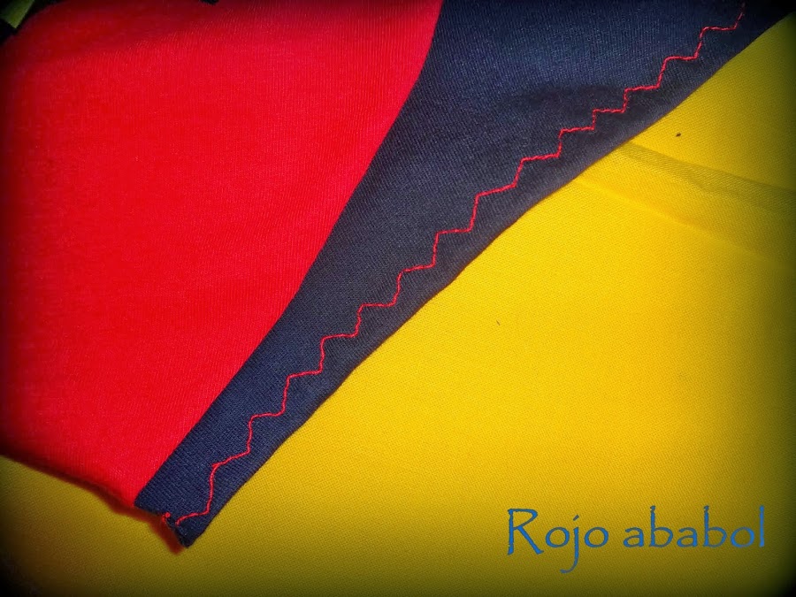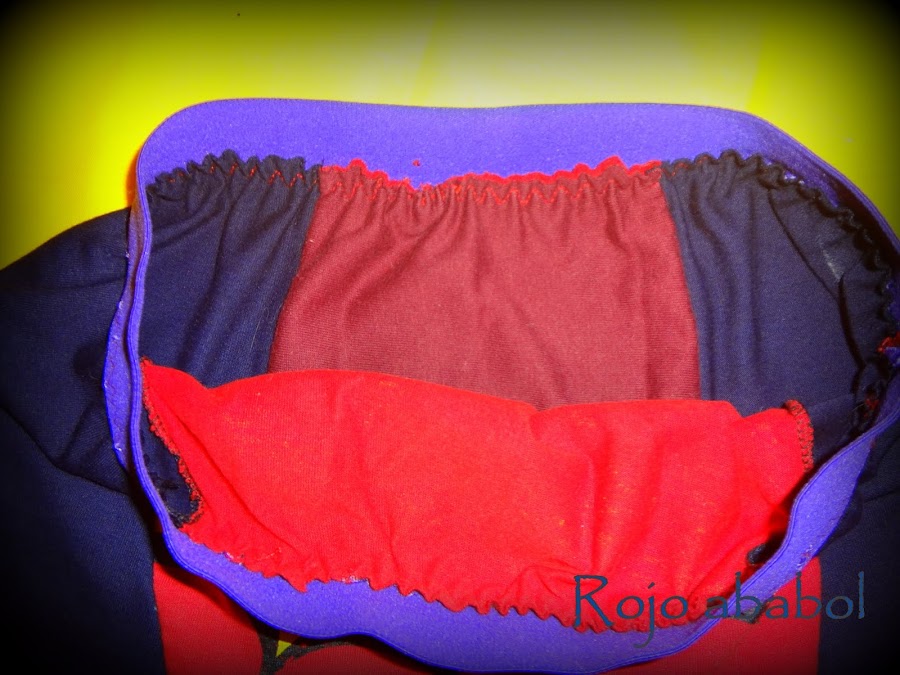 Los laterales en marino con una suya, la parte interior granate una manga de una mía y las piezas delantera y trasera en rojo y estampado de una del bollito. Vamos, reciclaje a tope de camisetas de toda la familia!! ja ja ja