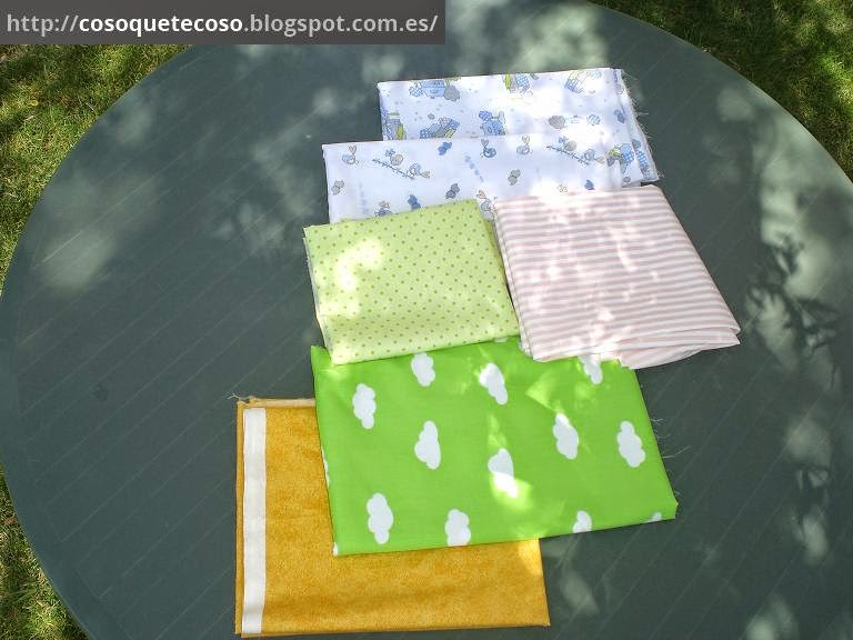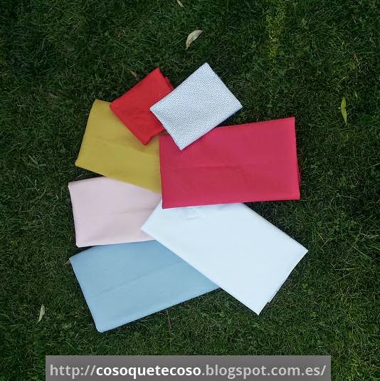 También un par de telas de sábana (en fucsia y blanco), la roja que está en el medio que no consigo saber de qué es pero siempre que voy la compro porque la uso mucho para forros y está a 2,40 euros el metro, y la de topitos que está al lado a 6,40 euros el metro.