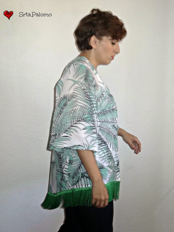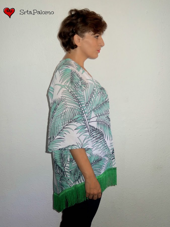 En el bajo, cómo veis, le he puesto unos flecos, que por lo que he visto después es de lo más "trendy" y le da un rollito gipsy. El verde es un tono que contrasta , a mi juicio bastante bien (pero sé de buena tinta que hay personas a las que no les gusta ), con el verde de la tela y le da un toque veraniego pues los tonos de éste retal son un poco apagados. Me gusta el movimiento que confieren los flecos XD