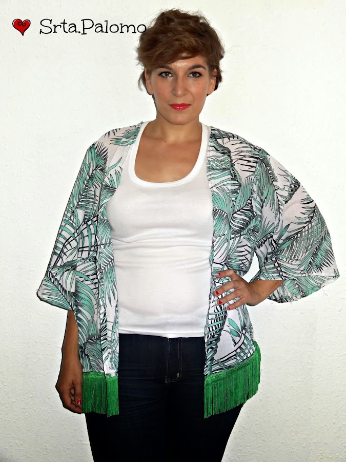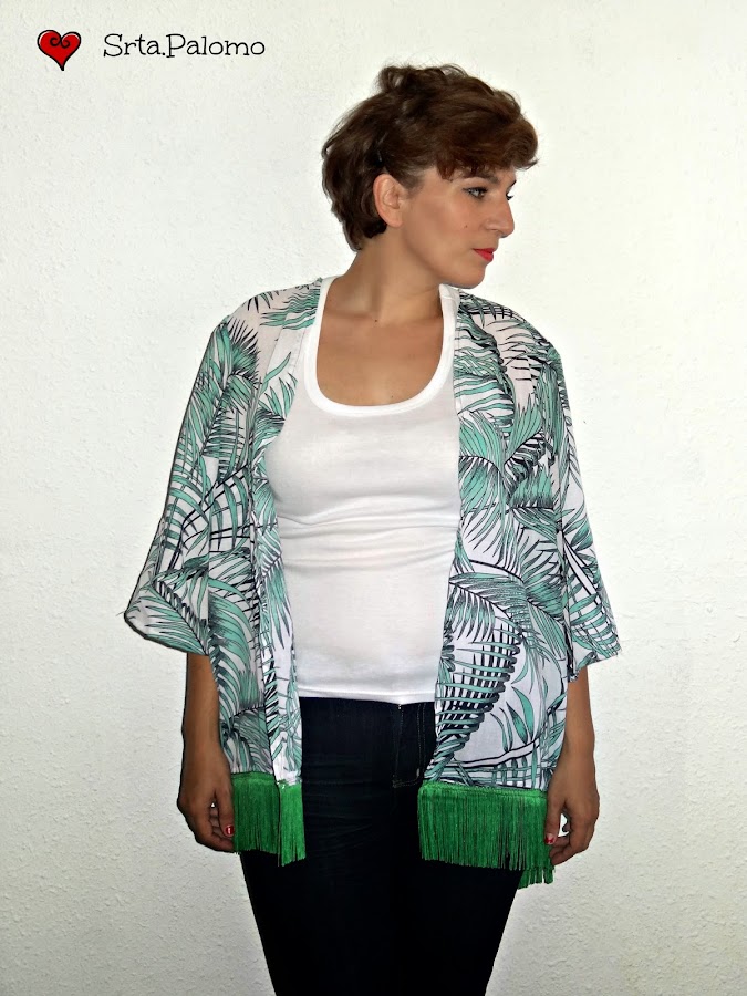 En el bajo, cómo veis, le he puesto unos flecos, que por lo que he visto después es de lo más "trendy" y le da un rollito gipsy. El verde es un tono que contrasta , a mi juicio bastante bien (pero sé de buena tinta que hay personas a las que no les gusta ), con el verde de la tela y le da un toque veraniego pues los tonos de éste retal son un poco apagados. Me gusta el movimiento que confieren los flecos XD