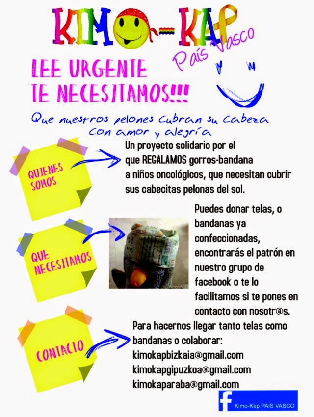 Kimo-Kap es un proyecto para facilitar gorros-bandana a nuestros niños oncológicos. Con la llegada del buen tiempo es muy importante que estos niños tengan su cabeza bien protegida del sol. Les resulta muy difícil encontrar pañuelos que cubran su cabeza por completo, y los que encuentran son muy caros. De ahí surgió la idea de coserlos nosotras.
