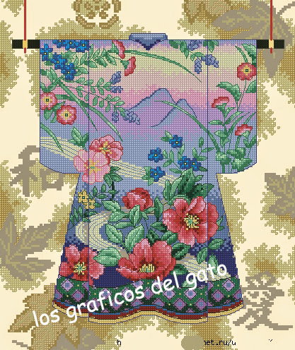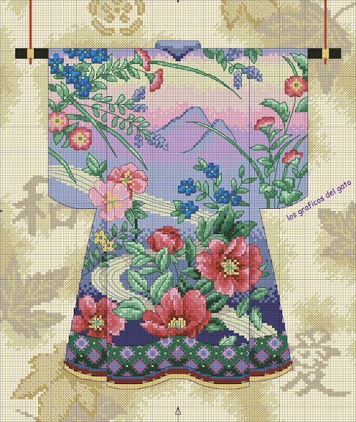 Precioso gráfico de un kimono en azul decorado con dibujos...