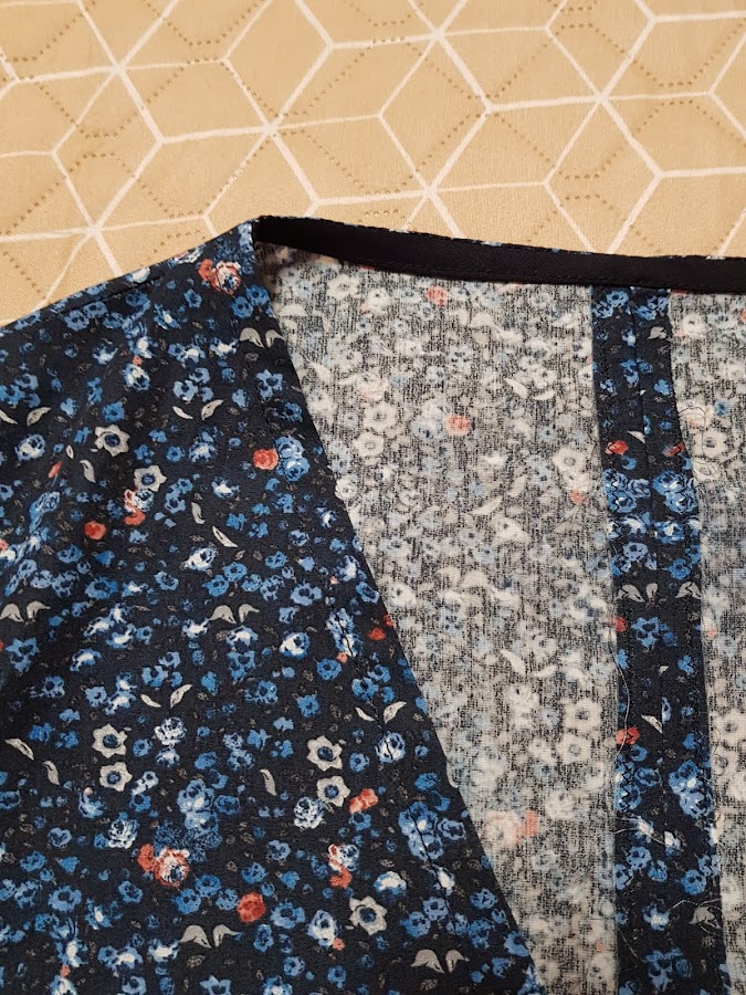 En la parte delantera lleva vistas del mismo tejido y en la parte trasera lleva cinta al bies de algodon de color azul marino .