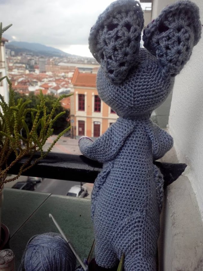 Aqui estaba contemplando Bilbao desde la terraza, mientras yo seguia tejiendo a su pequeñajo