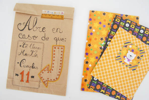 En el sobre mediano colocamos las tarjetas de felicitación con mucho naranja porque a Martín le encanta el color naranja.