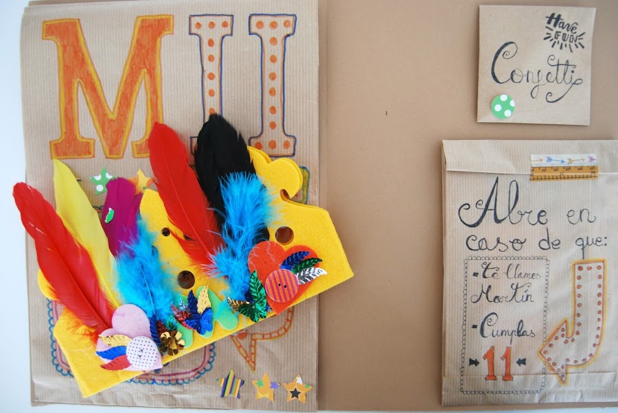 Nosotras preparamos lo que nos pareció imprescindible en cualquier cumpleaños: El sobre más grande tenía dentro una corona de cumpleañero nada minimalista, los cumples no pueden ser minimalistas, es un hecho :-). Se puede hacer con una corona de fieltro, pegamento y todos los abalorios que encuentres por casa.