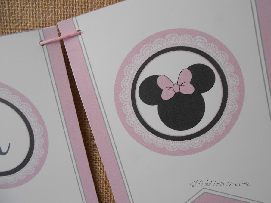 La mamá de Daniela se puso en contacto conmigo porque le había gustado mucho el kit de decoración personalizada Mickey Mouse pero lo quería en color rosa y con la ilustración de Minnie Mouse.