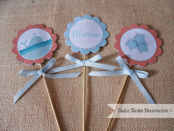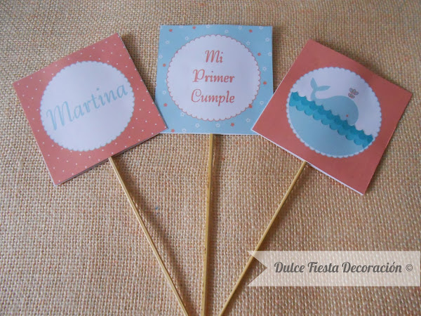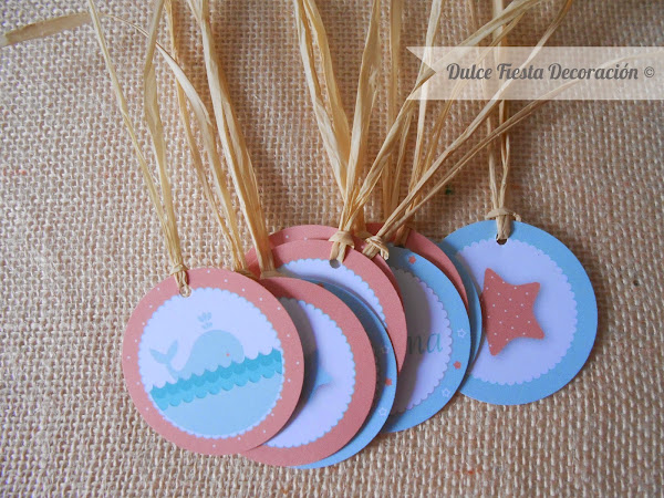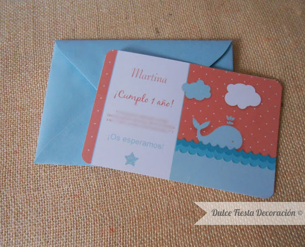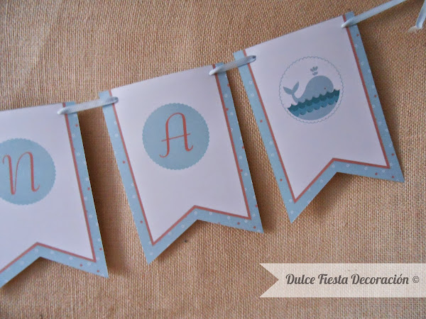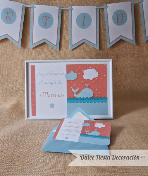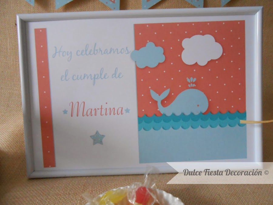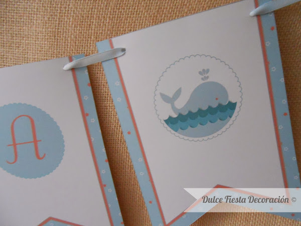 La decoración personalizada que hoy os traigo la he diseñado en dulces tonos coral y celeste y tiene como protagonista a una ballena muy juguetona.