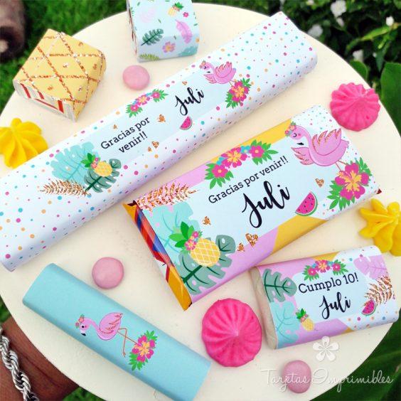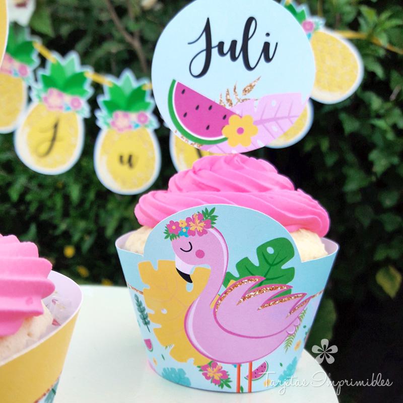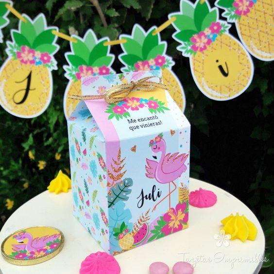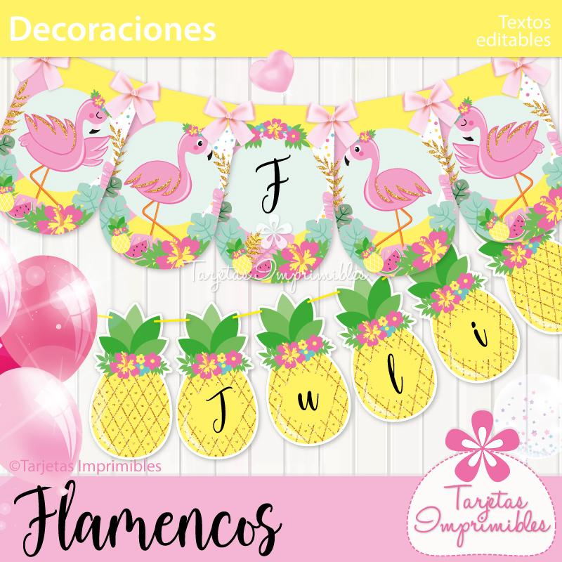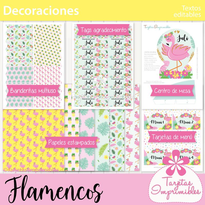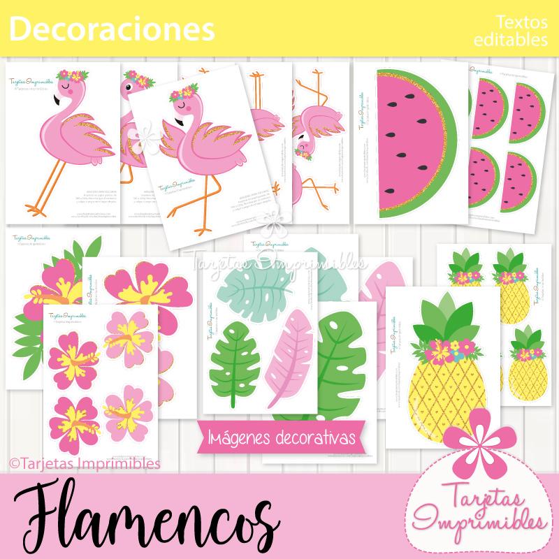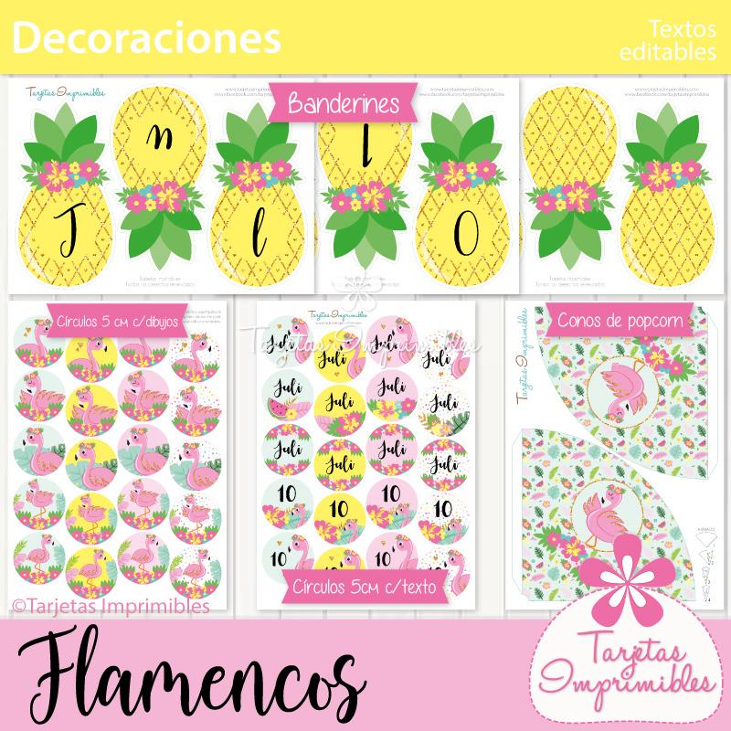 Cada temática que ofrezco en mi Tienda Online Tarjetas Imprimibles, está compuesta por kits armados según lo que quieras decorar. Por ejemplo, el Kit de decoraciones contiene todo lo referido a la “decoración” propiamente dicha de la fiesta. Banderines, centros de mesa, carteles de bienvenida, bonetes, molinitos, papeles estampados para envolver regalos, paquetes o forrar frascos. Tarjetitas de agradecimiento, etiquetas para botellitas, tarjetitas para comidas, o marcadores de sitio, conos para pochochos, círculos de varios tamaños, muchísimas imágenes de flamencos, flores, sandías, ananá y hojas tropicales, y muchas cosas más!