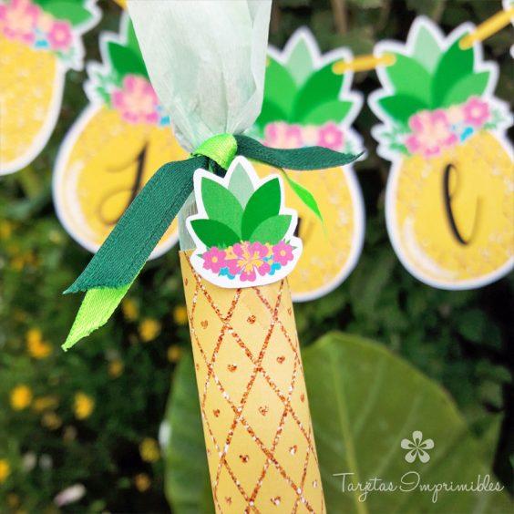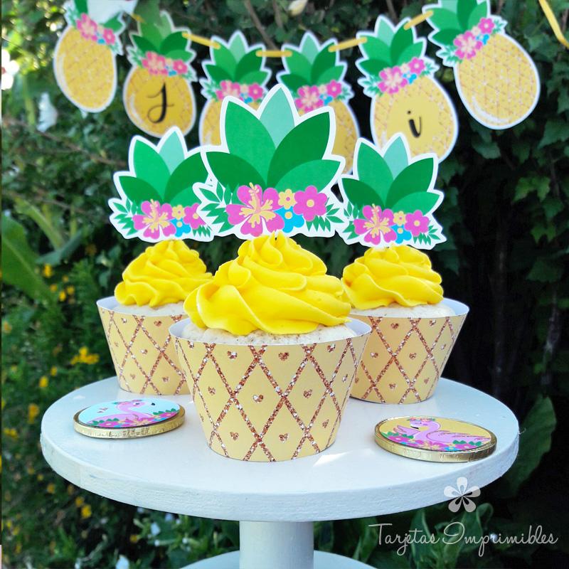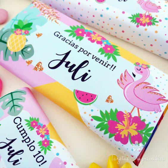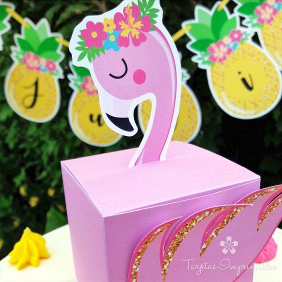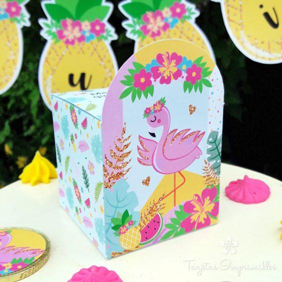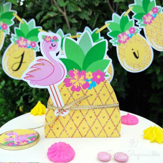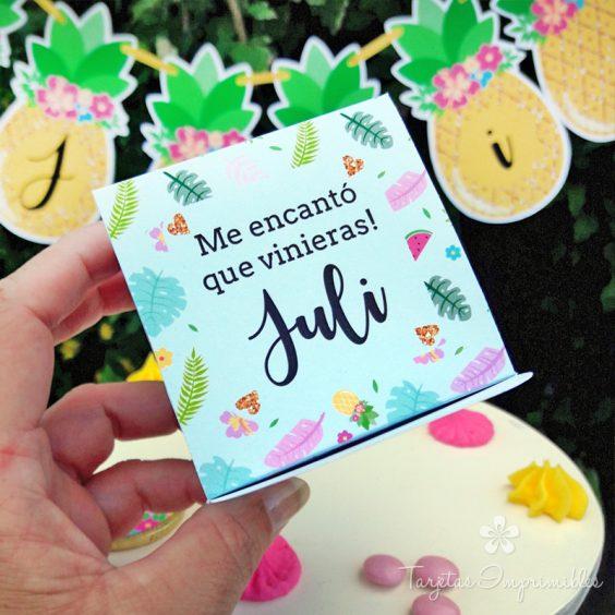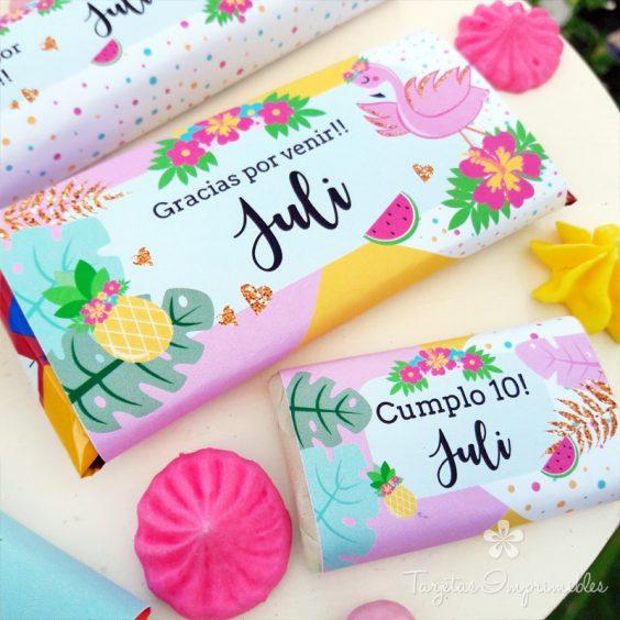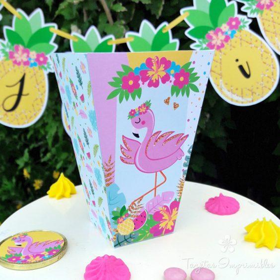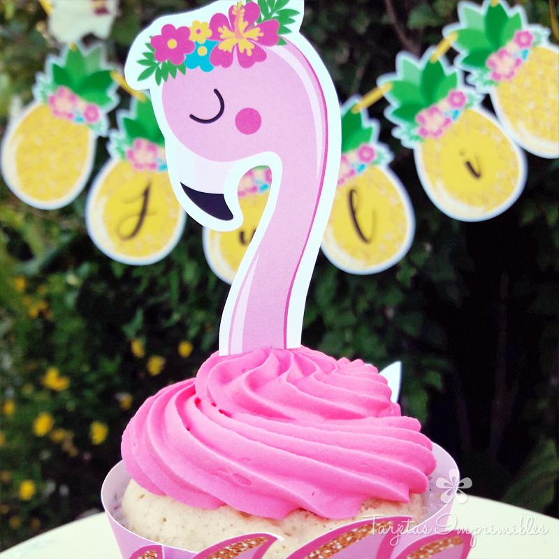 Cada temática que ofrezco en mi Tienda Online Tarjetas Imprimibles, está compuesta por kits armados según lo que quieras decorar. Por ejemplo, el Kit de decoraciones contiene todo lo referido a la “decoración” propiamente dicha de la fiesta. Banderines, centros de mesa, carteles de bienvenida, bonetes, molinitos, papeles estampados para envolver regalos, paquetes o forrar frascos. Tarjetitas de agradecimiento, etiquetas para botellitas, tarjetitas para comidas, o marcadores de sitio, conos para pochochos, círculos de varios tamaños, muchísimas imágenes de flamencos, flores, sandías, ananá y hojas tropicales, y muchas cosas más!
