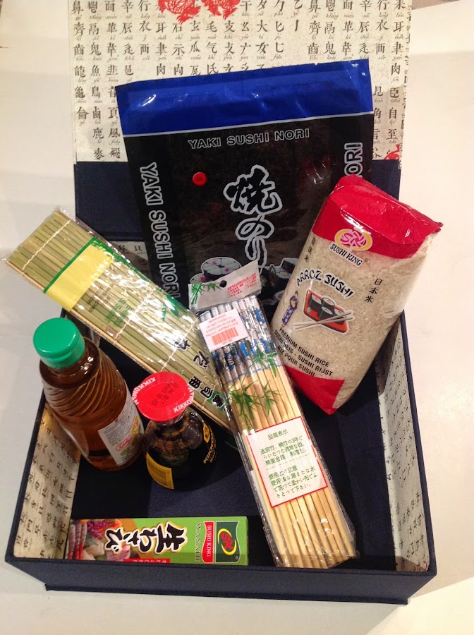 Regalo de Navidad para Juan, kit para hacer sushi con caja realizada con la técnica del cartonnage