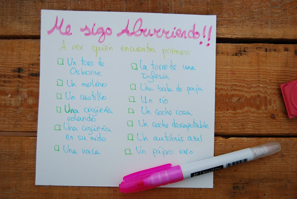 4. Me sigo aburriendo... Pues a ver quien encuentra primero un toro de Osborne, un molino, un castillo, una cigüeña volando, una cigüeña en su nido, una vaca, la torre de una iglesia, una bala de paja, un río, un coche rosa, un choce descapotable, un autobús azul, un pájaro raro...