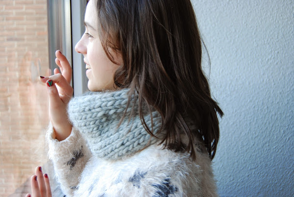 Si es que la lana es de esos objetos que tienen la capacidad de trasmitir ternura por sí sola. Por eso cuando esta navidad me regalaron esta lana tan gordita y tan gustosa, a punto estuvo de quedarse como decoración :-). Pero cuando empezó este frío furioso, no pude resistirme a empezar algo, y digo algo porque empecé sin ton ni son, sin tener claro que aquello iba a ser una bufanda o la funda de un cojín... Pero el frío furioso nos dio la solución, ni funda, ni bufanda, lo que necesitábamos era un cuello súper abrigoso para salir a la calle sin miedo a la congelación.