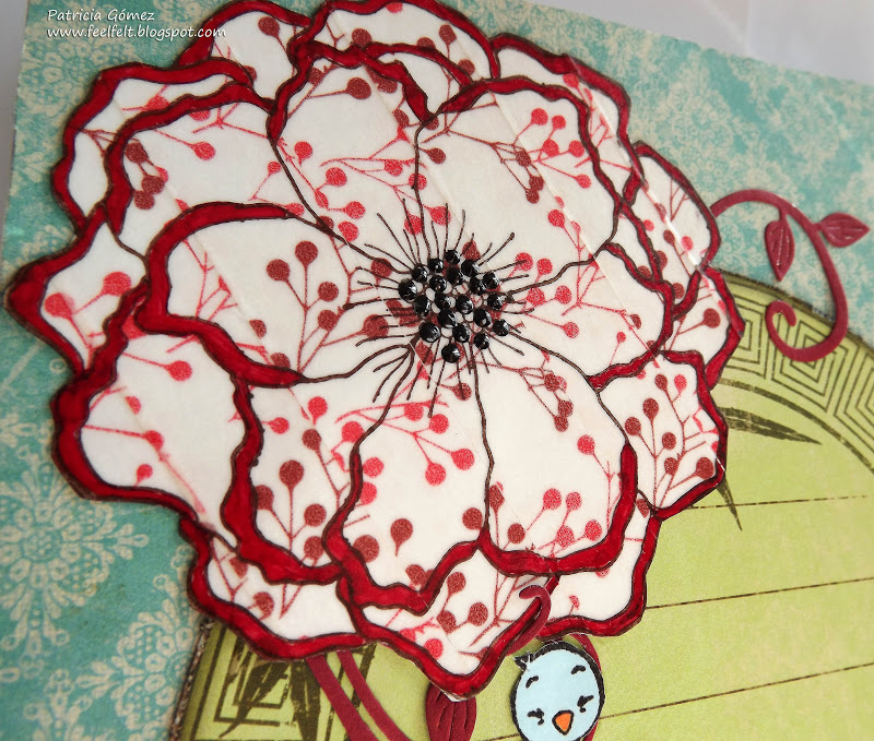 La flor es el sello Hero Arts Stencil Flower, ha sido estampado sobre franjas de masking tape de la marca We R Memory Keepers RED Washi Tape.