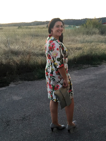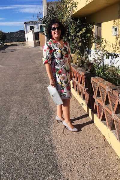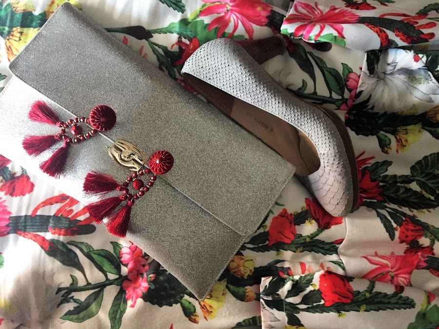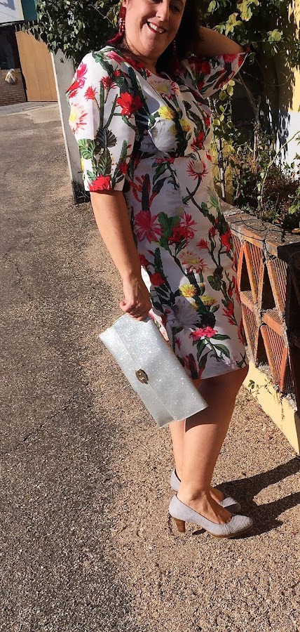 Para estrenarlos decidí combinarlos con este vestido handmade estampado con una tela de raso que me encanta, es suave y super agradable y combina con mis nuevos pendientes, además de con unos zapatos de salón gris y un bolso de mano gris con purpurina.