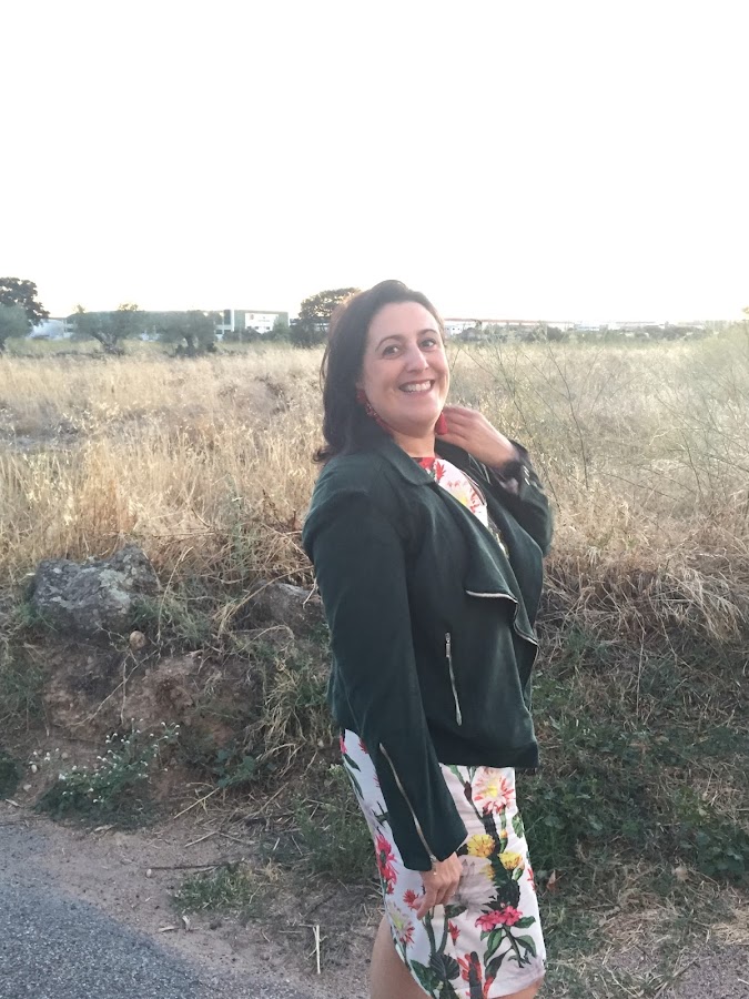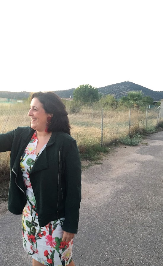 Además como estos días ha refrescado se vino conmigo mi biker verde que ya conocéis y que estaba deseando sacar del armario. Perdonad la calidad de las imágenes, pero entre el viento, que no dejaba de pasar gente y saludar y preguntar, que se estaba haciendo de noche, pues que no conseguí unas fotos mejores del look, pero espero que os guste, tanto el look handmade total, vestido y chaqueta, como los pendientes que son preciosos.