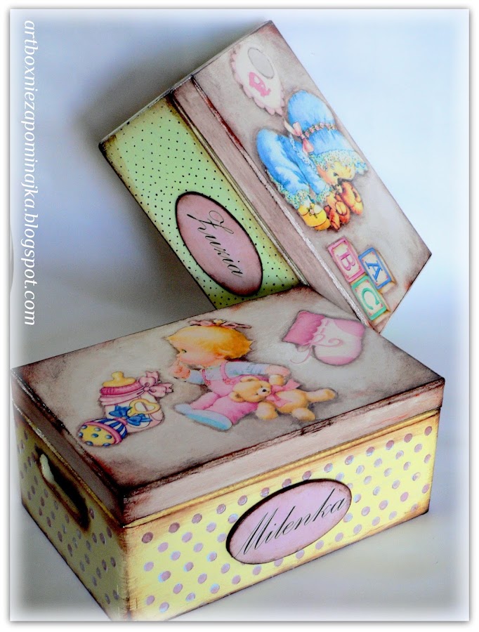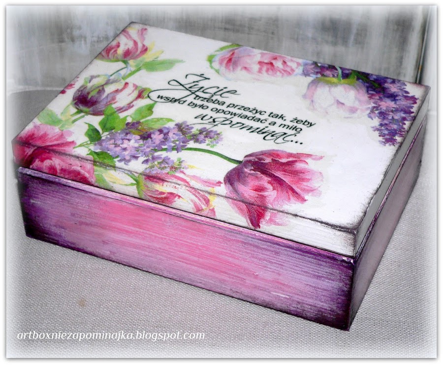 Busque por mucho tiempo motivos para estos cofres o cajas, no se como llamarlas para ninas. Las hize para dos princesitas para guardar recuerdos de su infancia. Motivos principales imprimi, todo el resto esta pintado a mano. Dos ultimas cajas era un encargo para dia de la madre que tenemos el 26 de mayo. No tengo cabeza para traducir bien esta sentencia, igual no se puede traducirlo exactamente como es en polaco pues lo pongo mas o menos, igual alguien se anima y hace una frase corecta: "La vida hay que sobrevivir asi que seria verguenza contarlo y bien o agradable? recordarlo".